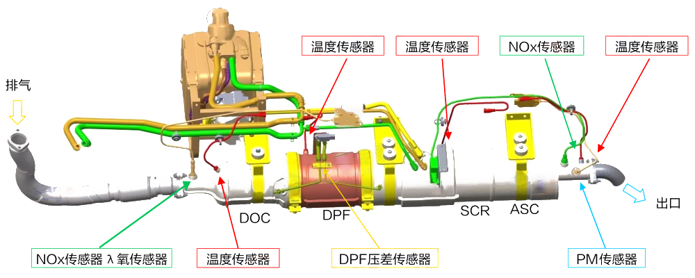 - 功能:用于监控测量发动机尾气中Nox含量的传感器,通过检测尾气中的Nox含量来调节尿素喷嘴的尿素喷射量来实现闭环控制。当尾气中的Nox含量超过排放限值及OBD限值后反馈给ECU进行报警,通过CAN线与ECU交换信息,由其自身的控制单元进行控制。